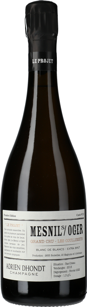 Adrien Dhondt, Le Mesnil-Sur-Oger, Les Coullemets, Grand Cru Blanc de Blancs Extra Brut получают из винограда сорта Шардоне, собранного с виноградника класса Гран Крю. Виноградник Les Coullemets отдельный lieu-dit (отдельный участок), располагается в нижней части склона Мениль (Mesnil), рядом с известным участком Les Chttillons. Почвы богатые кальцием и мелом, белая известнячно-меловая основа. Почва тоньше в нижней части склона, что часто даёт более выраженную минерализацию. Les Coullemets — один из участков, где получаются вина с выраженной минерализацией и вертикалью, особенно благодаря расположению внизу склона, где почвы тоньше. Это усиливает стержень вина, энергию. Стиль Adrien Dhondt в этой линейке — очень винтажный, выражение терруара, минимальное вмешательство, с низкой дозировкой, что делает вино более прозрачным, терруарным.