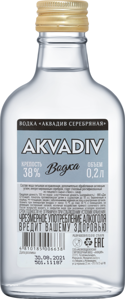 "Akvadiv" Silver — белорусская водка из эконом линейки с отличным соотношением "цена-качество". В состав водки входит высококачественный спирт класса "Люкс", специальная питьевая исправленная вода из артезианской скважины, которая обрабатывается активным углем из скорлупы кокосового ореха и ионами серебра, а также сахар для придания напитку легкой сладости. Водка разливается при крепости 38%, благодаря чему ее вкус остается удивительно мягким и питким. Водка составит отличную пару сытным блюдам русской, украинской и белорусской кухни, закускам, соленьям и маринадам.