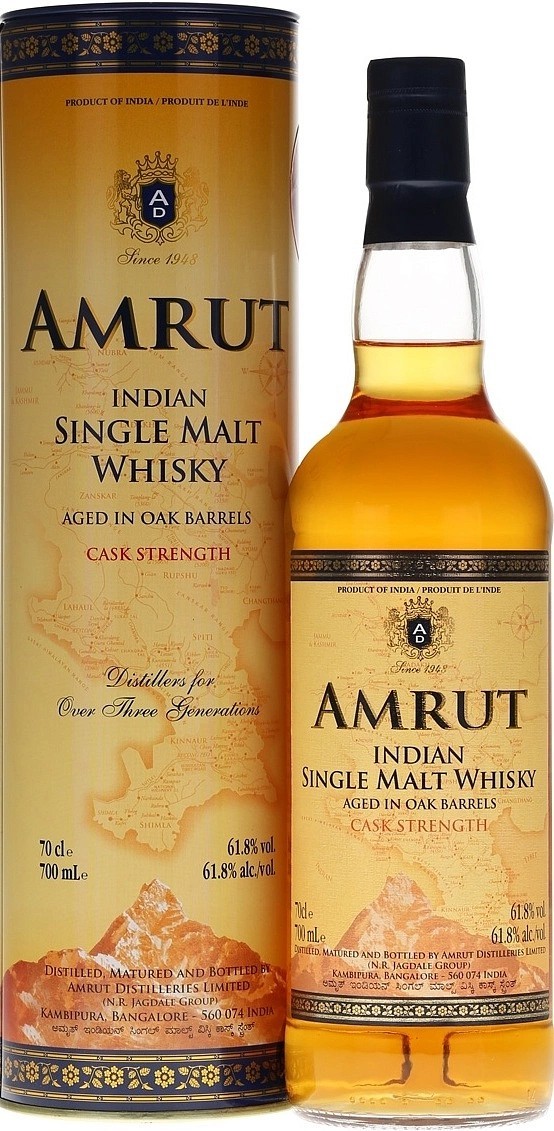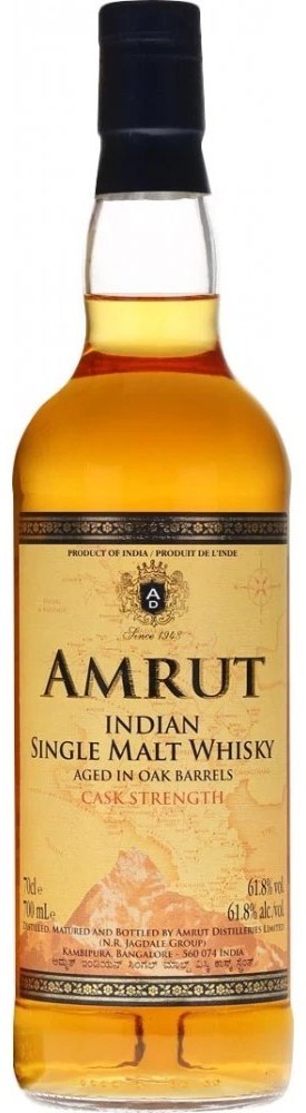 Amrut, Indian Single Malt, Cask Strength — односолодовый индийский виски, который не подвергался холодной фильтрации и был разлит по бутылкам при бочковой крепости в 61.8%. В изготовлении виски использовался отборный ячмень, выращенный у подножия Гималаев. Дистилляция небольшими партиями позволила сохранить натуральный аромат. "Амрут" Каск Стрэнз выдерживали в дубовых бочках. Выдержка проходила в уникальных условиях тропического климата, на высоте 3 тысяч метров над уровнем моря, в Бангалор — индийском городе-саде.