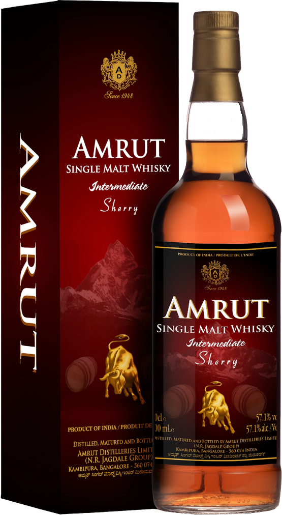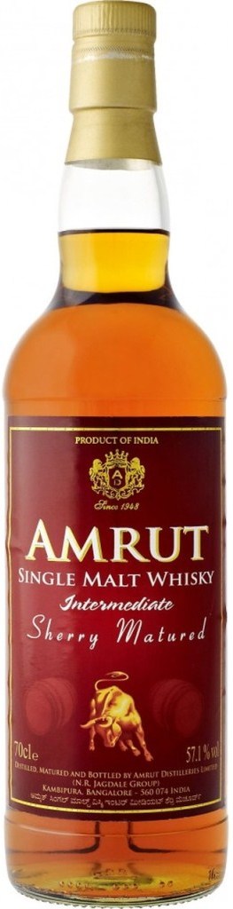 Amrut, Intermediate Sherry Matured — односолодовый индийский виски, который не подвергался холодной фильтрации. Свое название этот виски получил от способа выдержки: сначала его выдерживали в бочках из-под бурбона, после чего переместили в бочки из-под хереса и в конце опять перелили в бочки из-под бурбона. Крепость напитка составляет 57.1%. В изготовлении виски использовался отборный ячмень, выращенный у подножия Гималаев. Дистилляция небольшими партиями позволила сохранить натуральный аромат. Выдержка виски проходила в уникальных тропических условиях, на высоте 3 тысяч метров над уровнем моря, в индийском городе-саде Бангалор.