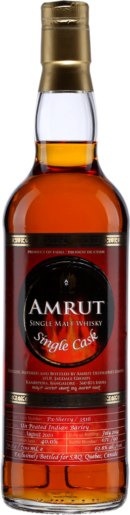 Amrut, Single Cask Sherry — односолодовый индийский виски, который не подвергался холодной фильтрации. Крепость напитка составляет 56.5%. При изготовлении виски использовался отборный ячмень, выращенный у подножия Гималаев. Дистилляция небольшими партиями позволила сохранить натуральный аромат. "Амрут" Сингл Каск Шерри выдерживали в дубовых бочках из-под шерри. Выдержка проходила в уникальных условиях тропического климата, на высоте 3 тысяч метров над уровнем моря, в Бангалор — индийском городе-саде.