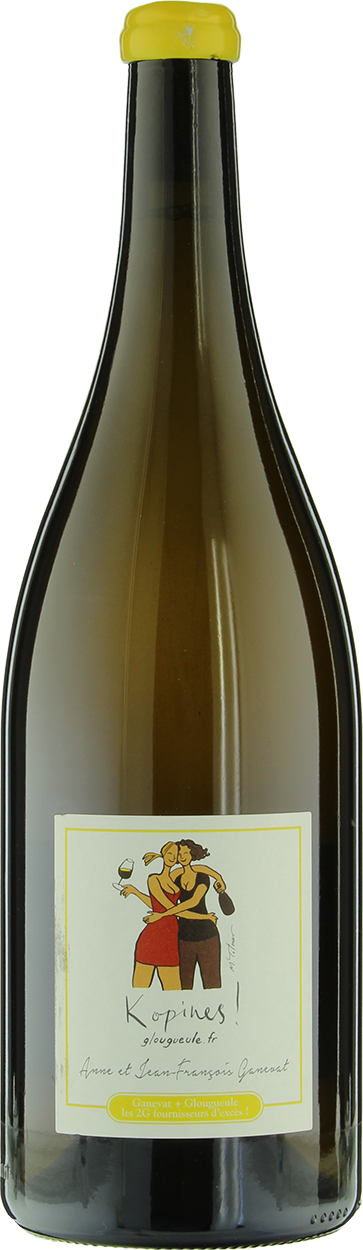 Anne et Jean-Francois Ganevat, Kopines! — зрелое, глубокое, чистое белое вино, которое легко пьется, но при этом обладает невероятной сложностью. Это вино — результат сотрудничества c биодинамическими производителями из других регионов. Так, в купаж вина входит Шардоне с собственных виноградников в Жюре, Шардоне из Бургундии и Алиготе. После ферментации с натуральными дрожжевыми культурами вино выдерживается в течение года в дубовых фудрах. Перед розливом вино не очищается и не фильтруется, сера не добавляется. Этикетку "Копин!" нарисовал известный дизайнер Мишель Толмер.