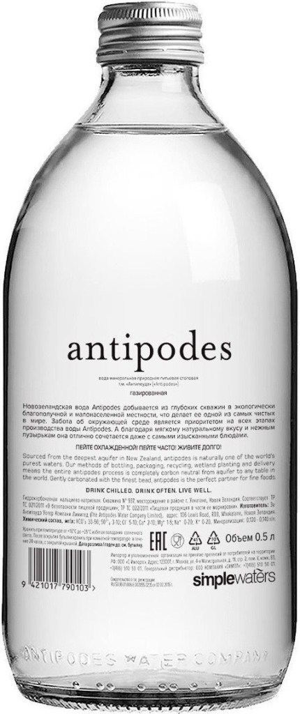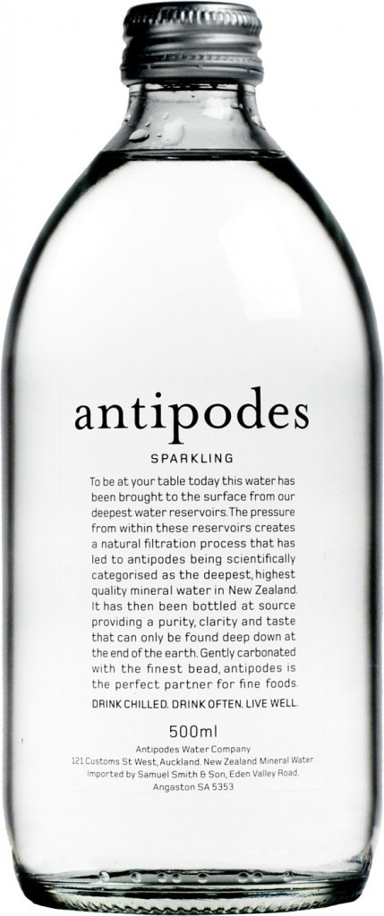Минеральная столовая питьевая газированная вода "Antipodes" берет свое начало в самом экологически чистом месте на земле, на северных островах Новой Зеландии, где на тысячи километров в округе нет никакой промышленности. Источник, из которого добывается вода, залегает на глубине 327-336 метров, на прохождение природного фильтра (слоев почвы) дождевой воде требуется более 50 лет. Вода разливается в бутылки прямо у родника Отакири в городе Вакатан, расположенном в мало заселенной местности Ротома Хиллз. Слоган компании-производителя гласит: "Drink chilled. Drink often. Live well." ("Пейте охлажденной. Пейте часто. Живите хорошо.")