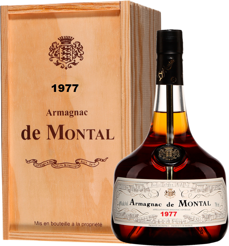 Armagnac de Montal, 1977 — винтажный арманьяк, выдержанный 37 лет в дубовой бочке. Мягкий и влажный климат региона Ба-Арманьяк способствует своевременному созреванию винограда, а богатые кремнием и глиной почвы дают арманьякам легкость и ароматность тонких фруктовых оттенков. Сбор урожая производится ночью, виноград поступает на винодельню при температуре не выше 15 °С, максимально сохраняя свой потенциал. Для того, чтобы сохранить богатый аромат винограда, дистилляцию вина для арманьяка де Монталь производят рано — с ноября по Рождество, хотя официально разрешено завершать дистилляцию 31 января следующего года. Сама дистилляция производится с использованием трех медных перегонных колонн. В них проходит непрерывная дистилляция, которая сохраняет характеристики каждого сорта и дает очень насыщенные о-де-ви, подходящие для долгой выдержки. Старение арманьяков Монталь проходит в древних погребах Шато де Рьетор. После перегонки арманьяк помещается в огромные 400-литровые бочки, которые были специально изготовлены из белого дуба, растущего в лесах Монлезон и Ле Фреш. В процессе выдержки арманьяк вбирает в себя древесные танины, а также аромат и цвет дуба, приобретает интенсивный, насыщенный букет и мягкий, маслянистый сложный вкус.