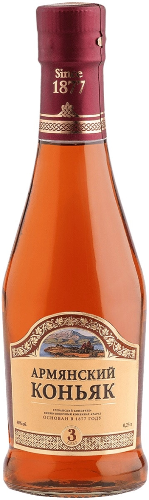 Армянский Коньяк, 3-летний создается из отборных коньячных спиртов, которые выдерживаются в дубовых бочках на протяжении не менее 3-х лет. Для изготовления спиртов используют автохтонные сорта винограда, выращенные на плодородных землях солнечной Армении. Коньяк отличается приятным, мягким вкусом и гармоничным ароматом. Коньяк рекомендуется употреблять в качестве дижестива, а также в паре с сухофруктами, шоколадом или чашечкой крепкого кофе.