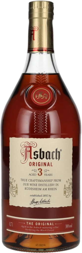 Asbach, Original 3 Years — популярный немецкий бренди из Рюдесхайма, известный ранее как "Asbach" Uralt. Хуго Асбах начал производство этого бренди в 1892 году, с тех пор и по сей день стандарты качества его изготовления остаются неизменными. Он приобрел большую популярность во время Первой и Второй мировых войн, когда в Германии было размещено много английских солдат. Сегодня этот бренди постоянно входит в десятку лучших товаров в Германии. Купаж бренди состоит из 25 различных вин, он проходит долгий процесс многократной дистилляции, а затем созревает не менее 3-х лет, дольше, чем предписанные законом 6 месяцев, в небольших бочках из лимузенского дуба.