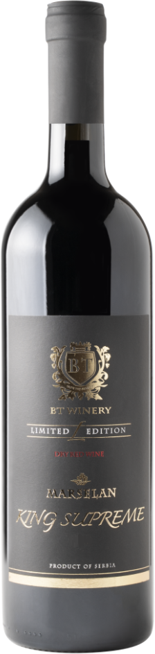 BT Winery, "King Supreme" Marselan — красное сухое вино из винограда сорта Марселан, который выращивается на собственных виноградниках компании в регионе Срем. Благоприятный микроклимат и почвы, состоящие из толстых слоев мергеля и песчаника, идеально подходят для выращивания качественного и здорового винограда. Марселан — сорт, впервые появившийся во Франции в 1961 году путем скрещивания Каберне Совиньон и Гренаш. Первоначально его выращивали в долине Роны во Франции, затем в Швейцарии, Калифорнии и Испании, в Сербии этот сорт появился относительно недавно. Собранный в момент оптимальной зрелости виноград подвергается ферментации в деревянных бочках при контролируемой температуре 23-28°C. Вино выдерживается в 225-литровых барриках на протяжении 12 месяцев, а затем бутилируется без предварительной фильтрации.
