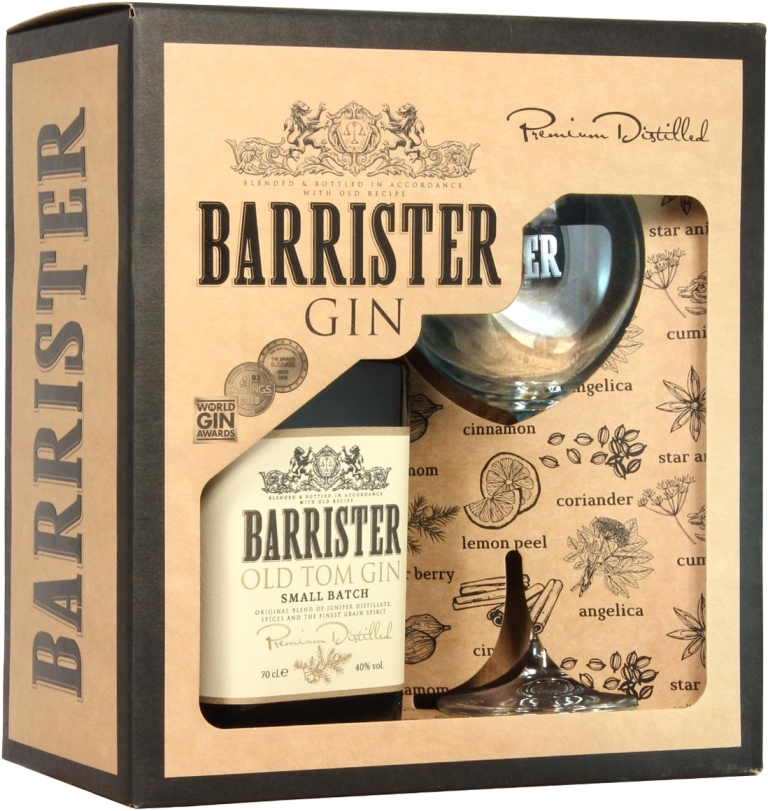 Barrister, Old Tom Gin — джин, созданный по оригинальному британскому рецепту. В его основе — купаж из дистиллятов, каждый из которых создавался отдельно. Среди компонентов джина — можжевеловые ягоды, цедра лимона, дягиль и набор пряностей: кардамон, кориандр, душистый перец и мускатный орех, а также миндаль и перец кубеба. Согласно старинному британскому рецепту готовый джин немного подслащается, чтобы вкус приобрел необходимую полноту и округлость.