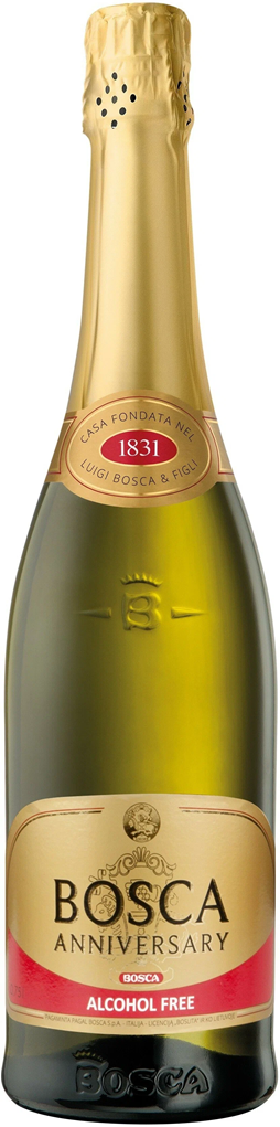 Bosca, Anniversary, Gold Label Alcohol Free — белый полусладкий безалкогольный игристый винный напиток, обладающий тонким вкусом с элегантными фруктовыми нотками, плавно переходящими в соблазнительное послевкусие. Он является отличным аперитивом, а также хорошо гармонирует с легкими закусками, салатами, десертами и сырами. "Bosca Anniversary" — незаменимый спутник на вечеринке, романтическом ужине или торжестве.