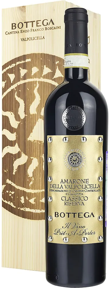 Bottega, "Il Vino Pret-A-Porter" Amarone della Valpolicella Classico Riserva — одно из значимых итальянских вин, покорившее самые изысканные вкусы гурманов во всем мире благодаря своей неповторимой индивидуальности, очарованию и характеру. Бутылка, украшенная яркой кожаной этикеткой с металлическими заклепками, для этого благородного вина была создана американским дизайнером, Дениз Фосил.