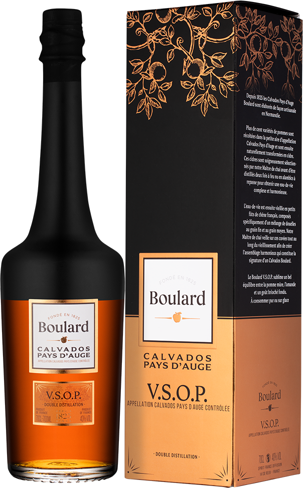 Boulard VSOP получен путем смешивания нескольких сортов кальвадоса из апелласьона Pays d'Auge. Количество сортов, использованных в ассамбляже, доходит до 20, а их выдержка в дубовых бочках колеблется от 4 до 10 лет. Boulard VSOP является замечательным кальвадосом, который отличается сложным ароматом, а также сбалансированным и мягким вкусом с бархатистым послевкусием. Великолепный Булар VSOP в элегантной коробке может стать отличным подарком для любителей высококачественных напитков!