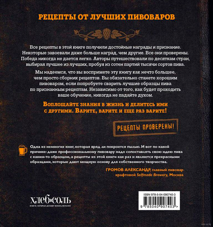 Основной автор книги, Джамиль Зайнашефф, — многократный победитель конкурсов среди домашних пивоваров, проводящихся в Америке и во всем мире. С его первой золотой медали, полученной на конкурсе Американской Ассоциации Домашних Пивоваров в 2002 году, он неоднократно становился номинантом и победителем подобных конкурсов. Эта книга является сборником всех тех рецептов пива, которые он представлял на соревнованиях. Состоящая из 27 основных глав, книга предлагает рецепты тех основных категорий пива, которые представляют собой номинации в подобных конкурсах, и каждый основной рецепт дополняется несколькими вариантами, так что в целом читателю предлагается 80 рецептов пива домашнего изготовления, охватывающих весь спектр разновидностей пива, известных в наши дни и доступных для домашнего производства.