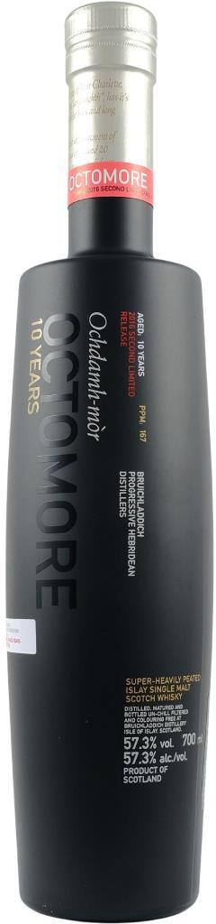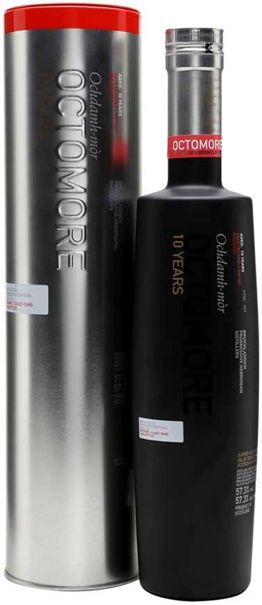 Octomore, 10 Years Old — роскошный виски с сильным характером, третий выпуск которого состоялся в 2018 году после длительной 10-летней выдержки. Этот виски немного отличается от своих родственников такой же подкатегории из-за иного пути созревания, чем его десятилетние предшественники. Он представляет собой, в некотором роде, "лоскутное одеяло" из множества дистиллятов, которые в период с 2008 по 2018 год хранились в разных типах бочек (из-под бурбона, портвейна и коньяка). Розлив виски без подкрашивания и холодной фильтрации состоялся при бочковой крепости в 57.3%.