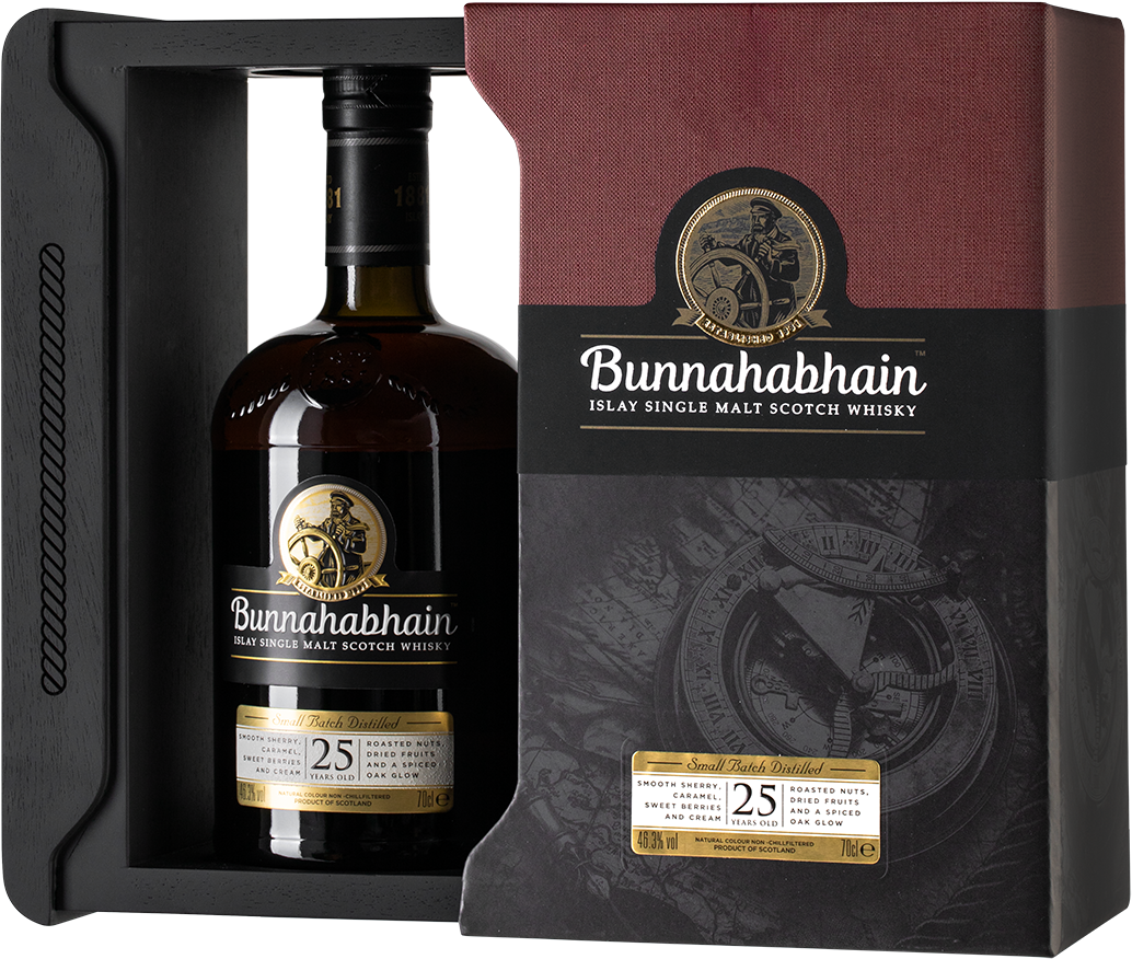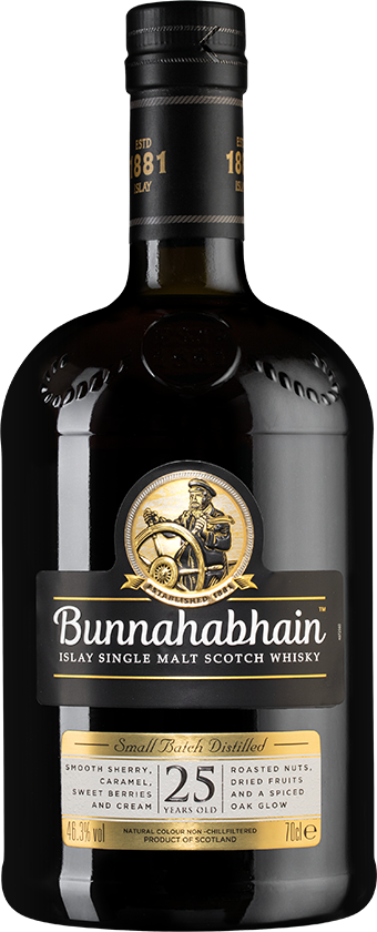 Bunnahabhain, 25 Years Old — великолепный супер-премиальный виски из основного ассортимента Bunnahabhain, имеющий в своей коллекции множество наград. Благодаря сильному влиянию хереса, "Буннахавэн" 25-летний является прекрасным примером того, насколько хорошо развивается "Bunnahabhain". Несколько лет в бочках из-под хереса наделили его сложными слоями сладких дубовых и ореховых оттенков.