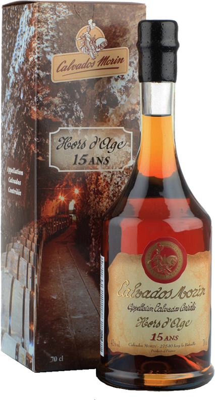 Calvados Morin, Hors d'Age 15 Ans — зрелый кальвадос от именитого производителя, проведший 15 лет в дубовых бочках. В производстве используются разные сорта яблок (горькие, сладко-горькие, кислые и сладкие), смешанные в точно выверенных пропорциях. Богатый вкус спирта гарантируется именно многообразием используемых сортов. Яблоневые сады расположены на землях Нормандии, где влажный океанический климат создает идеальные условия для выращивания "сидровых" яблок. Кальвадос выдерживается в 300-литровых бочках из лимузенского дуба в длинных галереях меловых холмов долины Эр. За долгие годы кальвадос постепенно развивает свой потенциал. Этому способствует и качество древесины, и влажная атмосфера пещер, и идеальная тишина.