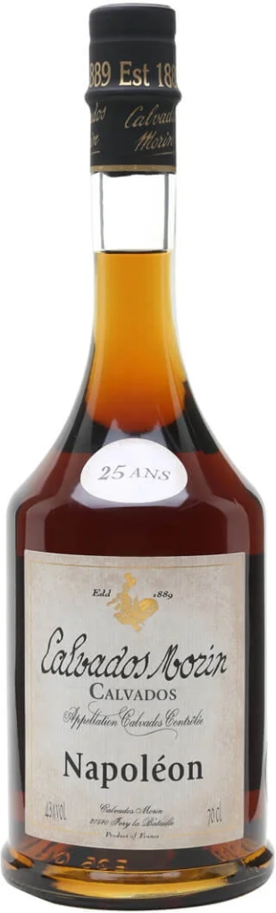 Calvados Morin, Napoleon 25 Ans — зрелый кальвадос от именитого производителя, проведший четверть века в дубовых бочках. Достаточно войти в комнату, где только что подали этот драгоценный напиток, чтобы понять повальное увлечение этим кальвадосом: сладкий запах еще горячего засахаренного яблока проникает в ноздри и уже возбуждает вкусовые рецепторы! В производстве используются разные сорта яблок (горькие, сладко-горькие, кислые и сладкие), смешанные в точно выверенных пропорциях. Богатый вкус спирта гарантируется именно многообразием используемых сортов. Яблоневые сады расположены на землях Нормандии, где влажный океанический климат создает идеальные условия для выращивания "сидровых" яблок. Кальвадос выдерживается в бочках из лимузенского дуба объемом от 300 до 400 литров в длинных галереях меловых холмов долины Эр. За долгие годы кальвадос постепенно развивает свой потенциал. Этому способствует и качество древесины, и влажная атмосфера пещер, и идеальная тишина.