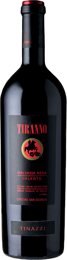 Красное сухое вино Cantine San Giorgio, "Tiranno" Malvasia Nera, Salento производится из винограда сорта Мальвазия Нера, выращенного в холмистой местности провинции Таранто. Собирают урожай вручную в середине сентября. На винодельне ягоды подвергаются дроблению и гребнеотделению с последующей ферментацией и мацерацией при контролируемой температуре 22-26°С в течение 8-10 дней. Выдерживается вино 8-12 месяцев в бочках объемом 10 гектолитров. Потенциал вина составляет 4-6 лет.