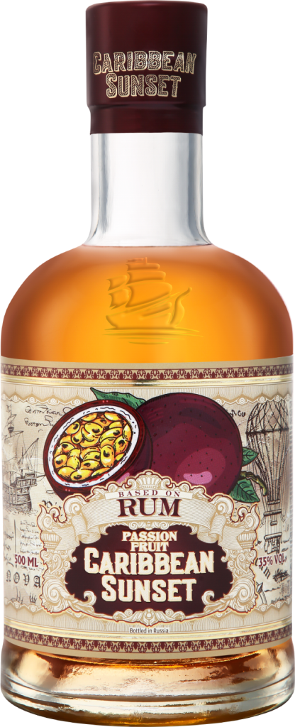 Caribbean Sunset, Passion Fruit based on Rum — спиртной напиток, изготовленный на основе ямайского рома и щедро обогащенный экзотическими нотками манго и маракуйи. Ямайский ром славится своим насыщенным вкусом и богатым ароматом, чему способствует давняя, проверенная временем технология, которой пользуются большинство ямайских производителей. В производстве традиционно используют сахарный тростник, обильно произрастающий на местных плантациях. Ромовый напиток является идеальной базой для многих коктейлей.
