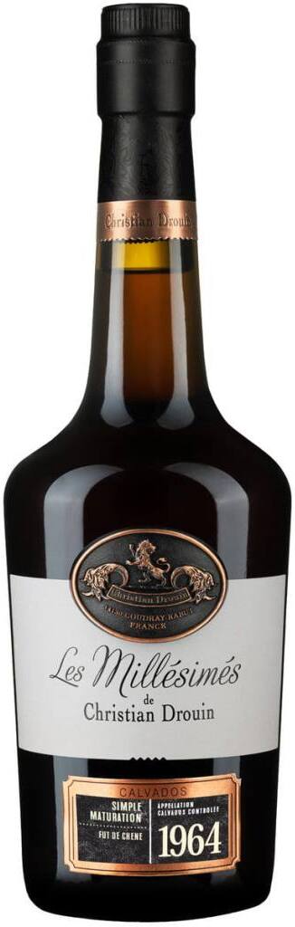 Christian Drouin, Calvados Pays d'Auge, 1964 — великолепный французский кальвадос из Нормандии, обладающий глубоким, вязким ароматом и прочным, длительным вкусом. Миллезимный кальвадос — это напиток определенного года дистилляции. Кальвадос 1964 года изготовлен путем двойной дистилляции в медном аламбике из яблок, выращенных в Пей д'Ож. Длительная выдержка кадьвадоса проходила в дубовых бочках их-под кальвадоса, а финишная выдержка — в бочках из-под Сотерна.
