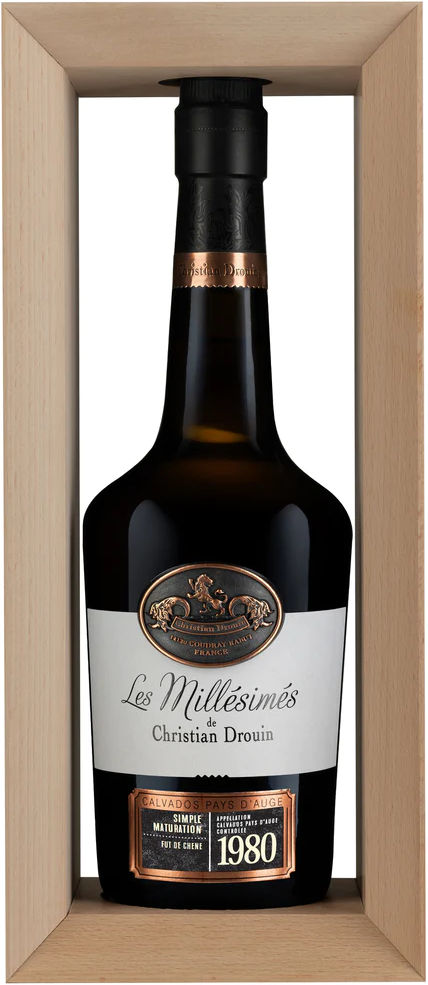 Миллезимный Кальвадос — это напиток определенного года дистилляции, который выдерживается в дубовых бочках не менее 20 лет перед продажей. Год, когда Кальвадос разливают в бутылки, указывается на этикетке. Благодаря тонкостям выдержки, каждый напиток неповторим! Christian Drouin, Calvados Pays d'Auge, 1980 года в изысканной деревянной коробке может стать идеальным подарком на любой праздник! Особенно интересен миллезимный кальвадос как подарок имениннику с таким же годом рождения.