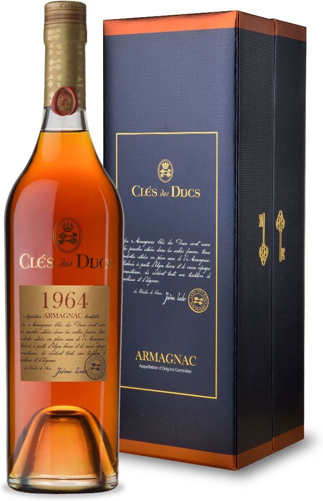 Классический винтажный арманьяк "Cles des Ducs" Millesime, Armagnac AOC произведен из винограда, выращенного в лучшей части провинции Арманьяк — на рыжих песчано-илистых почвах региона Ба-Арманьяк. Из белого винограда традиционных "коньячных" сортов, собранного в 1964 году, создали белое сухое вино традиционным методом. Виноградные спирты, дистиллированные из базового вина, поместили в новые и ранее использованные бочки из лимузенского дуба на многолетнюю выдержку. Вне зависимости от особенностей винтажа и удачности года, мастера подбирают такой профиль лимузенских бочек, чтобы добиться долгого, богатого и мягкого вкуса с легкой древесной ноткой.