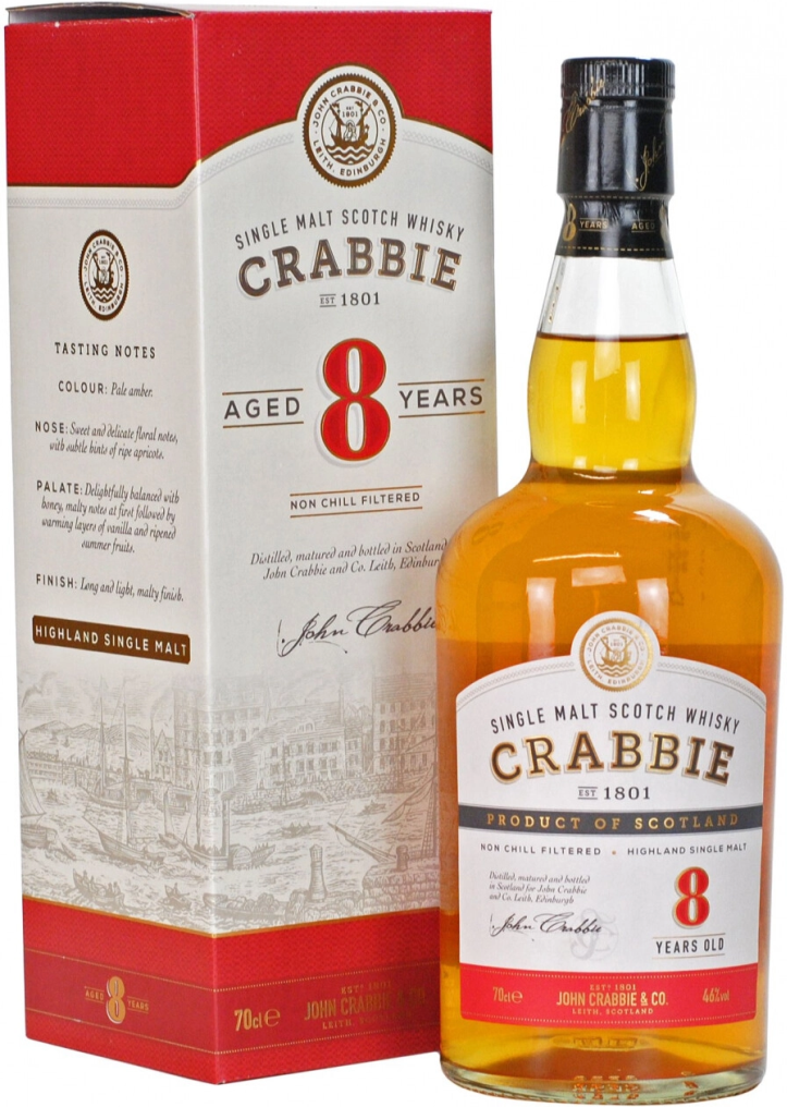 Crabbie, 8 Years Old, Highland Single Malt — односолодовый виски, выдержанный в течение 8 лет в дубовых бочках. Как правило, односолодовый шотландский виски принято употреблять в качестве самостоятельного напитка или со льдом, но производитель "Crabbie" 8 Years Old рассчитывает на то, что его продукт будут использовать для самых смелых алкогольных экспериментов.