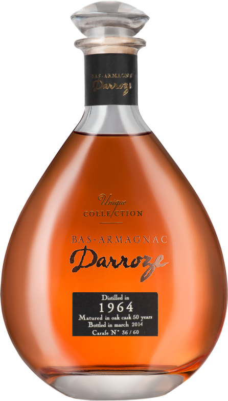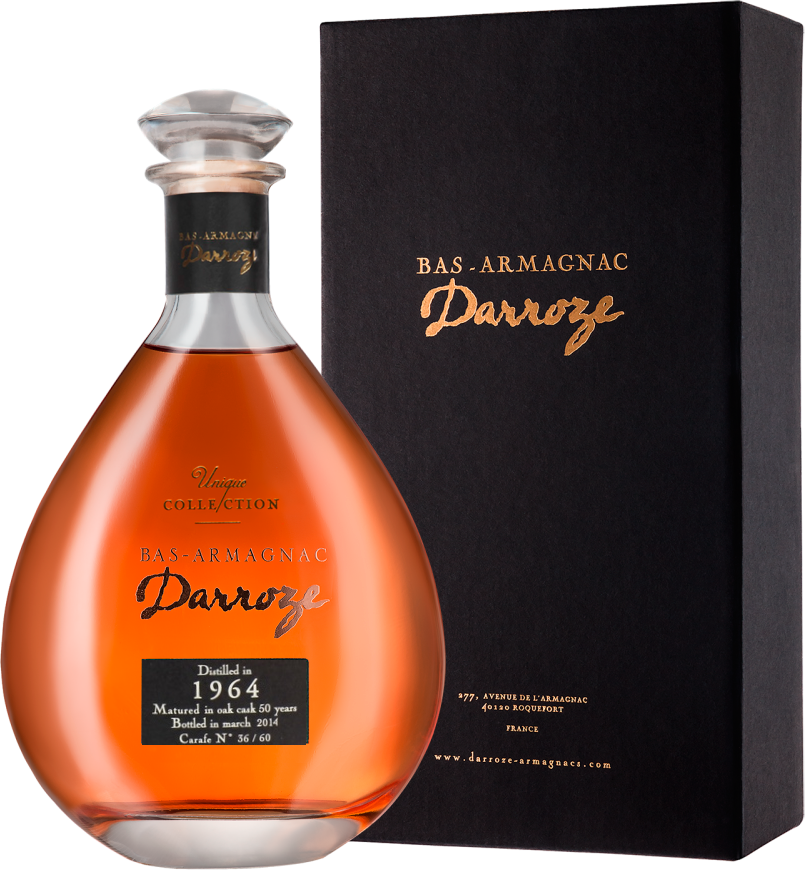 Darroze, Bas-Armagnac "Chateau de Gaube", 1964 — превосходный классический арманьяк от патриарха арманьяка Франсиса Дарроза. Спирты для напитка изготовлены в имении Chateau de Gaube, в окрестностях деревни Перки знаменитого региона Ба-Арманьяк, из винограда сорта Бако урожая 1964 года. Арманьяк был выдержан в дубовых бочках в течение 53 лет и разлит в стеклянные бутылки в январе 2017 года. Напиток не подвергался холодной фильтрации и не разбавлялся, поэтому он сохранил свой оригинальный вкус и бочковую крепость.