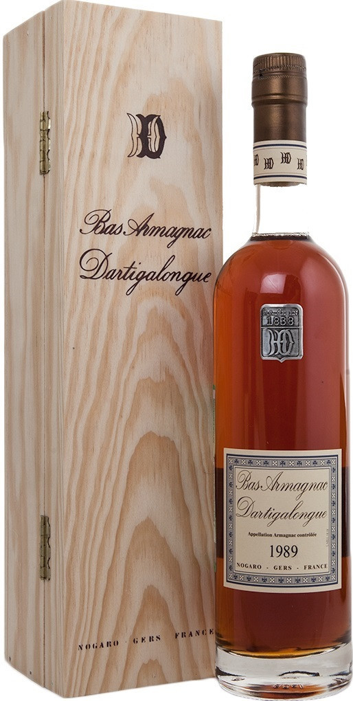 Dartigalongue, Bas Armagnac, 1989 — миллезимный арманьяк урожая 1989 года, созданный из лучших спиртов и выдержанный в дубовых бочках. Для изготовления арманьяка используется виноград сортов Уни Блан, Бако, Фоль Бланш, выращенные в регионе Ба Арманьяк, Гасконь. Винтаж 1989 года демонстрирует богатый аромат, сладковатый вкус и согревающее послевкусие. Арманьяк является отличным дижестивом, а также рекомендуется к кофе или сигаре.