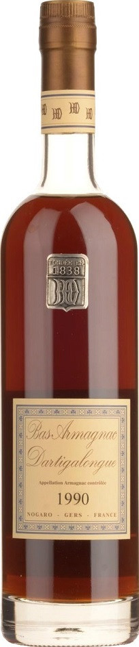 Dartigalongue, Bas Armagnac, 1990 — миллезимный арманьяк урожая 1990 года, созданный из лучших спиртов и выдержанный в дубовых бочках. Для изготовления арманьяка используется виноград сортов Уни Блан, Бако, Фоль Бланш, выращенные в регионе Ба Арманьяк, Гасконь. Винтаж 1990 года демонстрирует тонкий аромат, богатый вкус и приятное послевкусие. Арманьяк является отличным дижестивом.