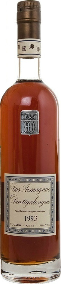 Dartigalongue, Bas Armagnac, 1993 — миллезимный арманьяк урожая 1993 года, созданный из лучших спиртов и выдержанный в дубовых бочках. Для изготовления арманьяка используется виноград сортов Уни Блан, Бако, Фоль Бланш, выращенные в регионе Ба Арманьяк, Гасконь. Винтаж 1993 года демонстрирует щедрый аромат, мощный вкус и сладковатое послевкусие. Арманьяк является отличным дижестивом, также можно подавать с кофе или сигарой.