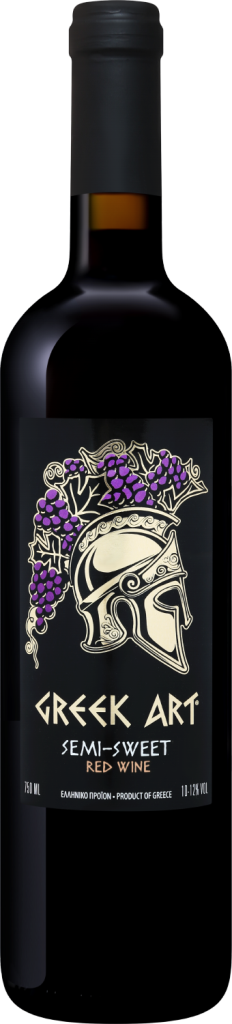 Dionysos Wines, Greek Art, Red Semi-Sweet — красное полусладкое вино, в производстве которого используюся автохтонные сорта винограда — Агиогритико и Мандилария. Винификация сусла включает ферментацию и мацерацию и проходит в стальных резервуарах. Вино рекомендуется подавать к блюдам из красного мяса, приготовленного на гриле или открытом огне с насыщенными соусами или маринадами, мясным закускам, ягодным десертам.