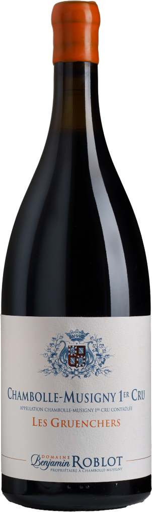 Domaine Benjamin Roblot, Chambolle-Musigny 1er Cru, Les Gruenchers — сложное, великолепно структурированное вино, в которое невозможно не влюбиться. Оно изготавливается из винограда сорта Пино Нуар с виноградника "Ле Грюаншер" класса Премье Крю, самого известного и часто считающего лучшим из 24-х Премье Крю в Шамболь-Мюзиньи. Этот виноградник, граничащий с великим Мюзиньи Гран Крю, обрабатывается органическими методами. Собранный урожай ферментируется в деревянных чанах с контролируемой температурой с использованием исключительно натуральных дрожжей. После 10 дней ферментации сусло прессуется вертикальным прессом для дальнейшего извлечения фенолов и вкуса. Затем вино выдерживается в бочках из французского дуба в течение 18 месяцев (20% бочек являются новыми). Перед розливом по бутылкам вино не осветляется и не фильтруется, сера добавляется в минимальном количестве.