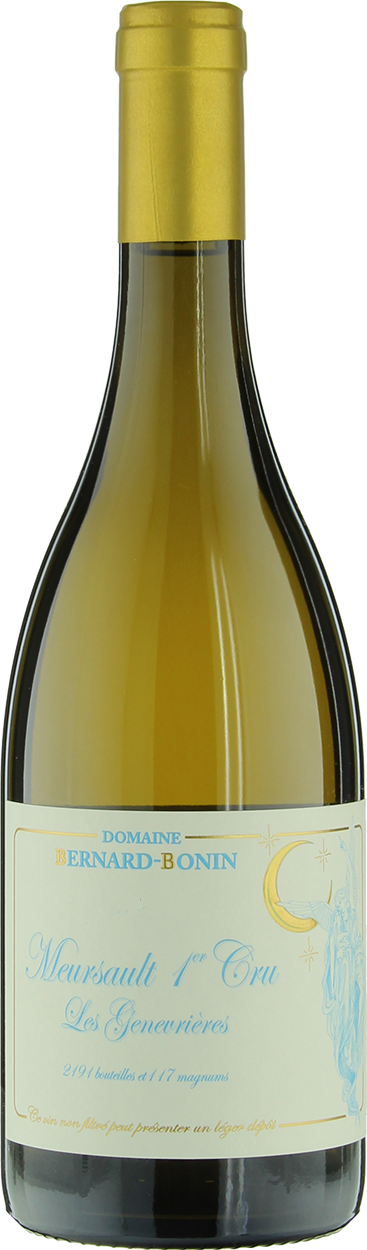 Domaine Bernard-Bonin, Meursault 1-er Cru, Les Genevrieres — прекрасное, интенсивное, натуральное белое вино из винограда сорта Шардоне, выращенного в Мерсо на органическом участке знаменитого виноградника "Ле Женевриер" класса Премье Крю. Собранный урожай помещается без дробления в пневматический пресс, где подвергается легкому прессованию. В тот же день сусло без отстаивания переливают для ферментации в бочки из французского дуба. По ее окончании вино выдерживается в течение 18 месяцев в бочках из французского дуба (30% новых) и разливается по бутылкам без фильтрации.