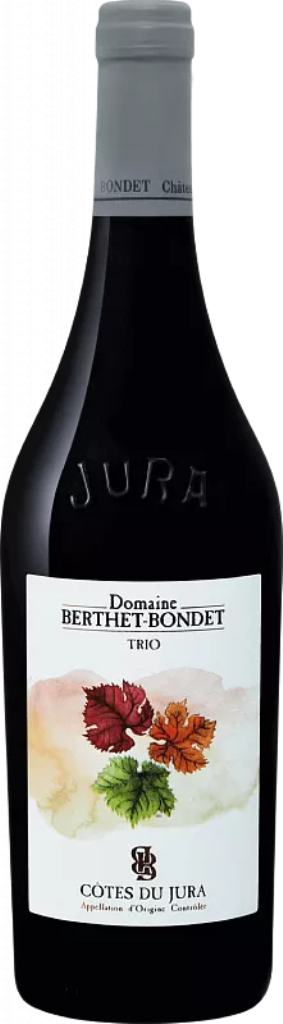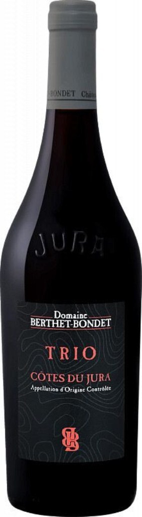 Domaine Berthet-Bondet, Trio — привлекательное красное вино, название которое указывает на три сорта винограда, составляющих его купаж. В него входят традиционные для региона Жюра сорта Пино Нуар, Труссо и Пульсар (или Плюссар, как его именуют на родине). Виноград выращивается на органическом винограднике с почвой из гравия и мергеля. Урожай собирается вручную с лоз, возраст которых в среднем составляет 15 лет. Плоды тщательно сортируются на вибростоле и проходят мацерацию целыми ягодами, вместе с гребнями, в течение недели. После ферментации вино выдерживается в течение 12 месяцев емкостях из нержавеющей стали. Потенциал хранения "Трио" составляет 5 лет.