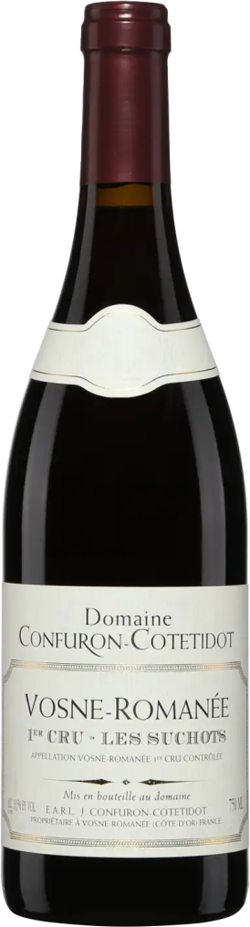 Domaine Confuron-Cotetidot, Vosne-Romanee 1-er Cru, Les Suchots — высококачественное красное вино, обладающее хорошей глубиной и длиной. Виноград для изготовления вина произрастает на винограднике "Ле Сушо" на 70-85-летних лозах. Урожайность лоз крайне мала, и Домену очень важно собрать плоды в степени идеальной спелости. Пино Нуар ферментируется целыми кластерами, вместе с плодоножками, поэтому вино получается чуть более дубильным, чем другие бургундские. Выдержка проходит в новых французских дубовых бочках и длится около двух лет. Перед бутилированием вино не фильтруется. Вино обладает длительным потенциалом хранения, оно может храниться более 20 лет, приобретая особую сложность и нежность.