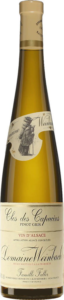 Domaine Weinbach, Pinot Gris "Clos des Capucins" — элегантное, сочное белое полусухое вино из винограда сорта Пино Гри, который выращивается на монопольном винограднике "Кло де Капусен", занимающем 5 гектаров земли. Когда-то давно этот участок принадлежал монашескому ордену Капуцинов и еще в конце IX века упоминался, как благоприятная для виноградарства земля. После ручного сбора урожай очень тщательно сортируется, отбираются только целые спелые ягоды, которые прессуются вместе с гребнями. После очень медленного и осторожного прессования сусло подвергается спонтанной ферментации с натуральными дрожжами в старых, очень больших дубовых бочках. В них же вино выдерживается 8-10 месяцев, чтобы максимально выразить аутентичность и сложность. Весь процесс изготовления вина происходит в соответствии со строгими биодинамическими правилами и нормами.