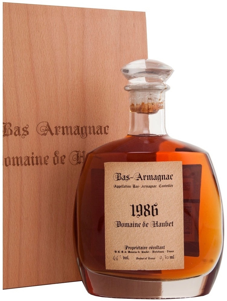 Domaine de Haubet, Vintage 1986 - арманьяк, изготовленный без каких-либо добавок и красителей из спиртов, выдержанных 27 лет в бочках, сделанных из гасконского дуба. Арманьяк характеризуется янтарным цветом, ярким, сбалансированным, маслянистым вкусом и многогранным ароматом с нотками дуба, кожи, орехов, кофе и сигарной коробки.
