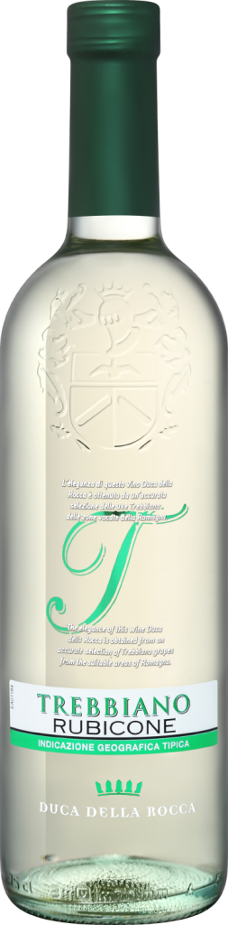 Duca della Rocca, Trebbiano — южное итальянское солнце в бокале. Это свежее и яркое белое вино создается из винограда сорта Треббьяно, выращенного на виноградниках компании в регионе Рубиконе. Название региона происходит от знаменитой реки Рубикон, которую пересек Юлий Цезарь в начале Великой римской гражданской войны. Сюда входят провинции Форли-Чезена, Равенна и Римини, а также юго-восточная половина Болоньи. Собранный в момент оптимальной зрелости виноград сортируют и мягко прессуют. Ферментация осуществляется в стальных резервуарах при строго контролируемой температуре. После фильтрации вино бутилируется.