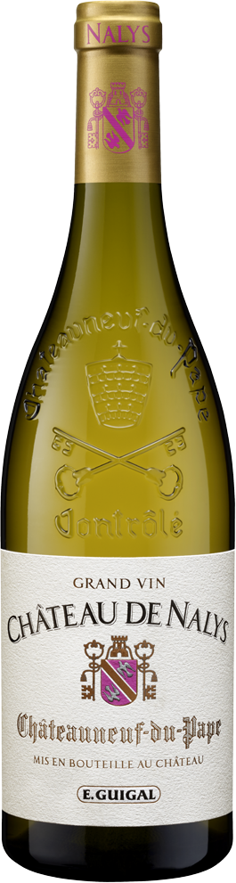 Chateau de Nalys, Blanc, Chateauneuf-du-Pape — изысканное белое сухое вино, в производстве которого используется виноград сортов Руссан, Гренаш Блан, Кларет, Бурбуленк и Пикпуль. Ягоды произрастают на виноградниках Шато де Налис "Nalys", "Bois Senechal" и "La Crau". Почвы состоят из красного песчаника, ронского булыжника и камней. Средний возраст виноградных лоз составляет 45 лет. Сбор урожая проводится вручную, на винодельне плоды подвергаются сортировке с последующим бережным прессованием. Ферментация проводится в дубовых бочках (70%) и в стальных резервуарах (30%). Выдерживается вино в барриках (70%) и в нейтральных чанах (30%) в течение 8 месяцев.