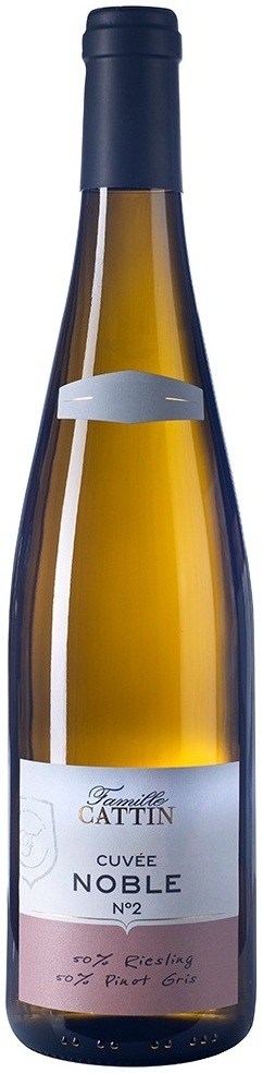 Famille Cattin, Cuvee Noble N°2, Alsace — восхитительно свежее белое полусухое вино из винограда сортов Рислинг и Пино Гри, смешанных в равных пропорциях, отсюда и название вина. Эти сорта считаются одними из самых благородных в Эльзасе. Виноград выращивается на глинисто-известняковых почвах собственных виноградников компании. На виноградниках применяются методы разумного земледелия, чтобы сохранить богатство уникального терруара и гарантировать урожай высокого качества. После сбора урожая, осуществляемого исключительно вручную, виноград медленно прессуют в пневматических прессах. Далее следует ферментация в стальных чанах при строгом температурном контроле. Этот процесс занимает от 3 недель до 2 месяцев. Вино выдерживается на тонком осадке в течение 2 месяцев.