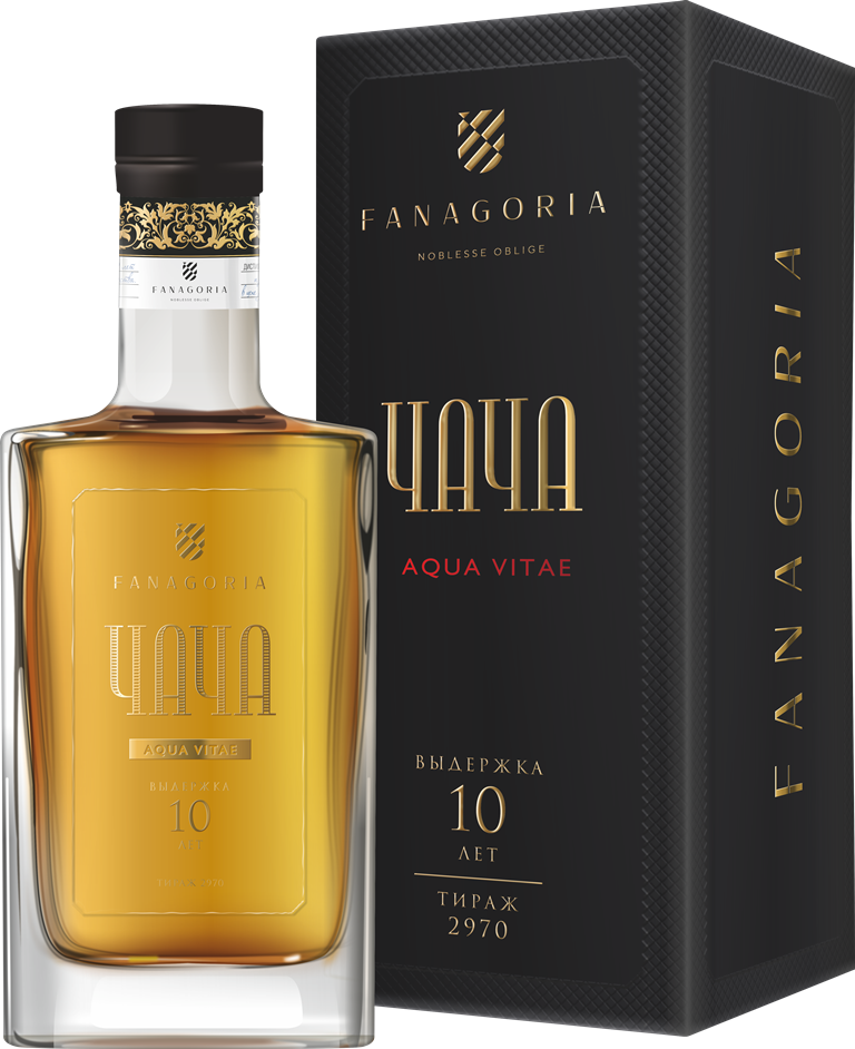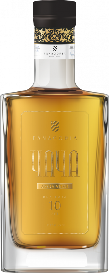 Фанагория, Чача, Аква Витае, 10 лет — виноградная водка, обладающая гармоничным, мягким вкусом и душистым фруктовым ароматом. Чача изготовлена методом двойной перегонки в медных кубах из сока винограда сорта Бианка урожая 2009 года, выращенного на фанагорийских виноградниках Таманского полуострова. Дистиллят выдерживался не менее 10 лет в бочках из скального кавказского дуба средней степени обжига, в течение всего процесса выдержки бочки не менялись. В отличие от 10-летних российских коньяков, чача "Aqua Vitae" создана из спиртов одного года урожая без добавления сахарного сиропа и колера. Всего было выпущено 2970 бутылок этого крепкого напитка.