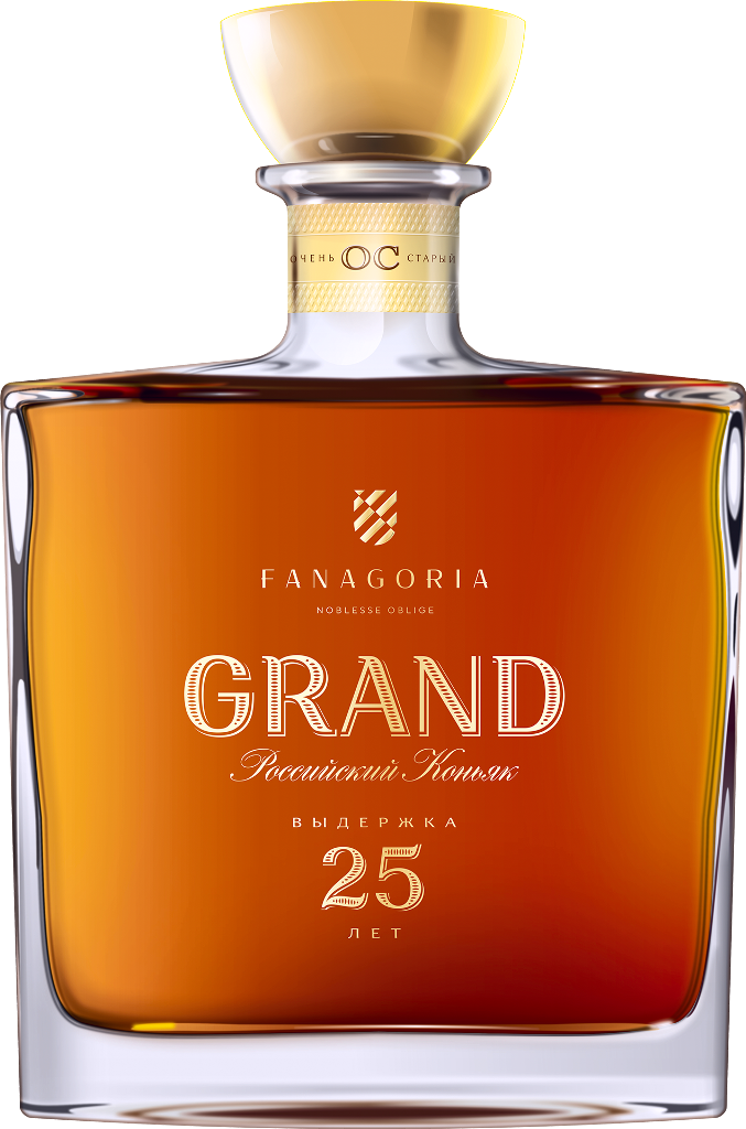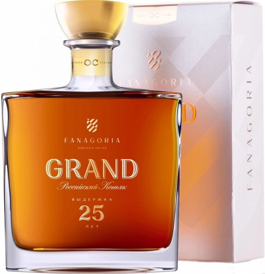 Фанагория, "Гранд" 25-летний — роскошный российский коньяк, изготовленный из купажа коньячных спиртов, выдержанных в дубовых бочках в течение 25 лет. Сырьем для производства служит собственный виноград сортов Алиготе, Шардоне и Рислинг, выращенный под солнцем Кубани. Коньяк следует подавать к сытным мясным блюдам, мясным закускам, десертам и фруктам.