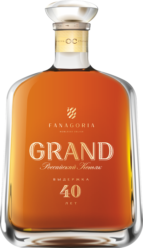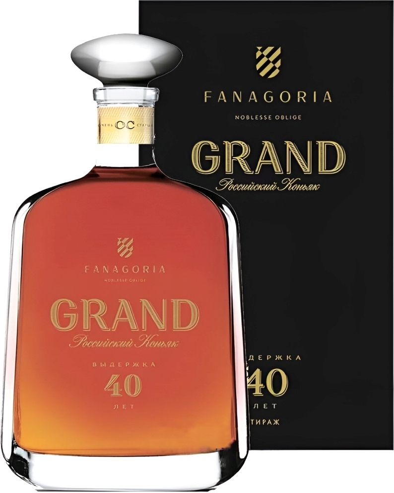 Фанагория, "Гранд" 40-летний — роскошный, выдержанный российский коньяк, изготовленный из купажа коньячных спиртов, выдержанных в бочках из кавказского, французского (Лимузенского) и американского дуба в течение 40 лет. Сырьем для производства служит собственный виноград сортов Алиготе, Шардоне, Ркацители и Рислинг урожая 1977 года, выращенный под солнцем Кубани. Коньяк следует подавать к сытным мясным блюдам, мясным закускам, десертам и фруктам.