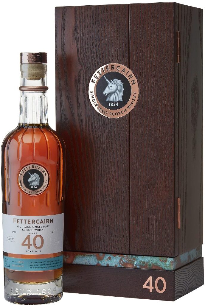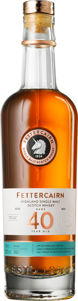 Fettercairn, 40 Years Old — редкий односолодовый виски компании "Феттеркерн", капля абсолютной роскоши, воплощение грации и стиля. Виски был дистиллирован 23 декабря 1977 года и выдерживался сначала в бочке из-под бурбона из американского белого дуба, а на финише — в бочонке из-под хереса "Apostoles". Всего было выпущено 818 бутылок этого роскошного виски.