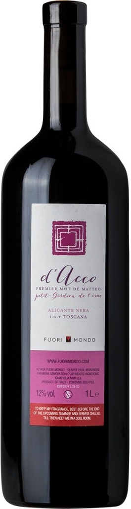 Fuori Mondo, d'Acco, Alicante Nera — молодое тосканское биодинамическое красное вино, названное в честь первых слов Маттео, сына Оливье Морандини — бельгийского нео-винодела, безумно влюбившегося в редкие великие терруары тосканского побережья. Вино производится из старого местного винограда сорта Аликанте Нера, собранного вручную с виноградников в Коста Тоскана, сертифицированных как органические и биодинамические. Ферментация проходит в цементных емкостях при контролируемой температуре. В них же вино выдерживается на протяжении 6 месяцев. Вино разливается в литровые бутылки, потому что, по словам Оливье, "в 750 мл всегда не хватает двух стаканов!". Потенциал хранения вина составляет 3 года.