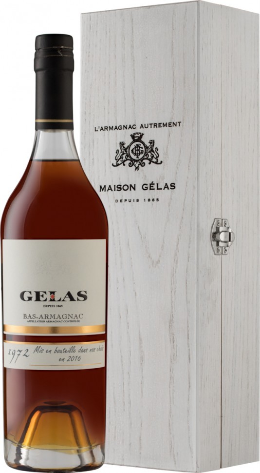 Gelas, Bas Armagnac, 1972 года — винтажный арманьяк из винограда сортов Бако и Уни Блан, прошедший выдержку в бочках из темного дуба. Миллезим отличается впечатляющей сложностью и элегантностью.