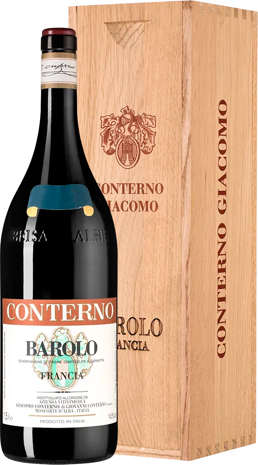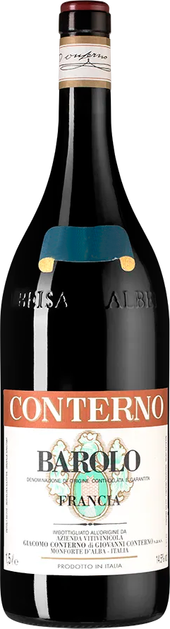 Giacomo Conterno, Francia, Barolo — роскошное красное вино, в производстве которого используется виноград сорта Неббиоло. Ягоды произрастают на винограднике "Франча" в Пьемонте. Сбор урожая проводится исключительно вручную, на винодельне плоды подвергаются сортировке с последующей ферментацией в нейтральных чанах со строгим температурным контролем. Выдерживается вино 48 месяцев в бочках из Славонского дуба. Перед поступлением в продажу, вино дополнительно выдерживается в бутылках в погребах винодельни.