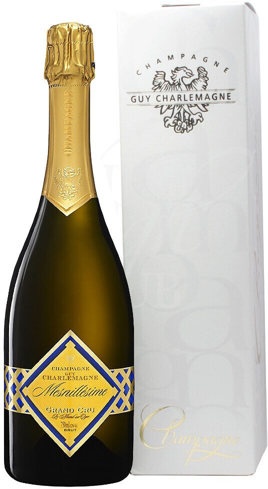 Guy Charlemagne, Mesnillesime, Grand Cru Blanc de Blancs — грандиозное шампанское из урожая с 70-летних лоз винограда сорта Шардоне, выращенных в Мениль-сюр-Ожер. Это настоящее сокровище Дома Ги Шарлемань, передающее изящество и изысканность терруара. Интересное название "Mesnillesime" образовалось в результате сочетания двух слов: "millesime", что значит "урожай", и Mesnil, части названия терруара.