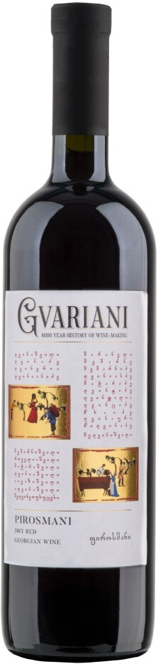 Gvariani, Pirosmani Red — ординарное красное сухое вино, для изготовления которого используют отборный виноград сортов Саперави и Каберне. Саперави представляет собой позднеспелый темнокожий сорт с розовой мякотью. Его название переводится с грузинского как "краски, красящий", что объясняет его интенсивный цвет. Характерная кислотность винограда делает его идеальным для моносортовых и купажных вин. Каберне, растущий в сухом и жарком климате Кахетии, тяготеет к более фруктовому, округлому и мягкому вкусу с роскошными оттенками черных ягод и кофе мокко. Процесс винификации протекает по традиционному методу производства красных сухих вин.