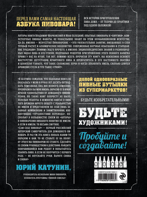 Много писать о книге «Сам себе пивовар» не имеет смысла, ее надо просто открывать, читать, изучать и тут же, как говорится, применять полученные знания на практике. Пивоварение не терпит отлагательств! Но для любопытствующих отметим, книга состоит из двух частей. В первой части собраны все самые интересные факты из истории пивоварения, уделено внимание сырью для изготовления пива и необходимому оборудованию, а также рассказано обо всех видах этого пенного напитка. А вторая часть предназначена для всех смельчаков, которые готовы испытать себя в роли пивовара! Здесь найдется масса подробнейших рецептов пива, так что справиться с поставленной задачей сможет даже новичок. И поверьте, домашнее пиво - это особенный вкус, насыщенный аромат и душа самого пивовара.